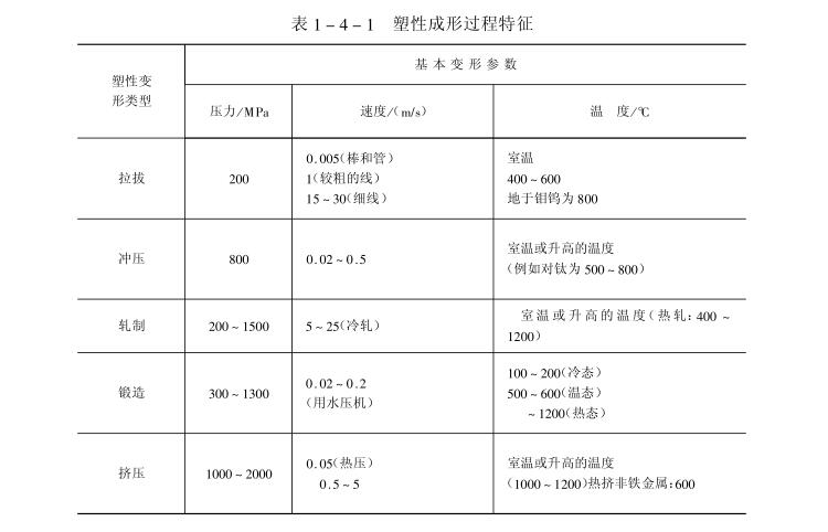 塑性成形中的摩擦不同于機械傳動過程中的摩擦,它是一種高壓下的摩擦。對受重載荷的軸承,工作時所受的壓力僅為20~40MPa,而塑性成形時與工具接觸的表面所受的壓力高達1000~2000MPa。不同塑性成形時的模具與毛坯相接觸處的壓力大小列于表1-4-1。